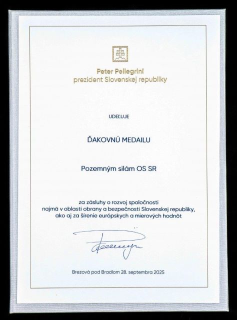 prezident Slovenskej republiky a hlavný veliteľ Ozbrojených síl Slovenskej republiky Peter Pellegrini udelil dňa 28.septembra 2025 v Brezovej pod Bradlom ďakovnú medailu Pozemným silám Ozbrojených síl Slovenskej republiky za zásluhy o rozvoj spoločnosti najmä v oblasti obrany a bezpečnosti Slovenskej republiky, ako aj za šírenie európskych a mierových dohôd.
